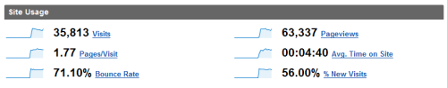 As you can see, the data gathered here was on 35,813 visits, so the information is pretty accurate. The average amount of time that people spent on a site was less than 5 minutes, and 71% of visitors "bounced" (left the site without clicking on anything).