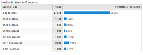 This new data made the "5 minute" average look really good! Over 75% of my visitors were spending a total of 10 seconds or less on my page.